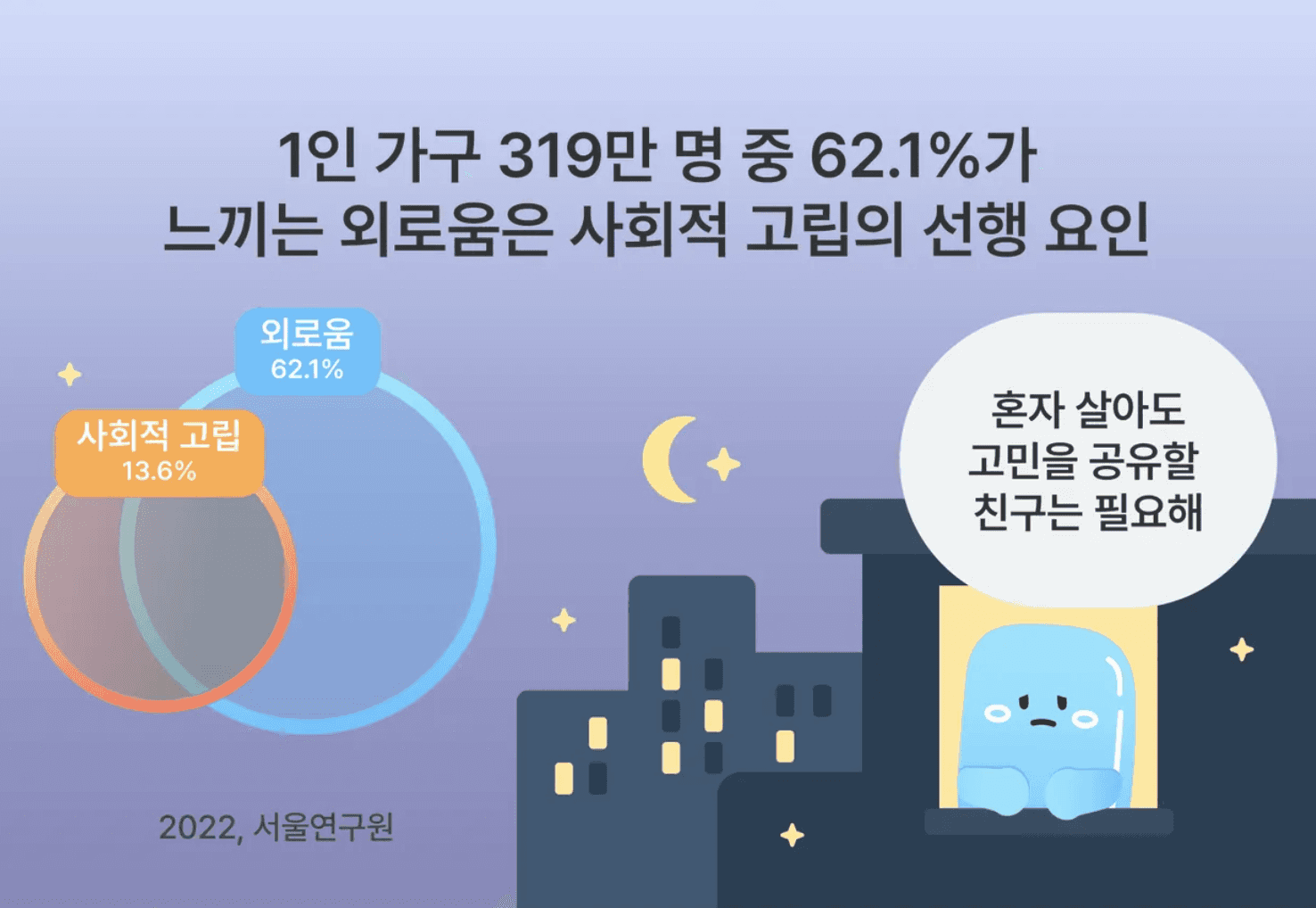사회 문제를 해결해보자는 문제의식에서 출발했습니다. 데스크 리서치를 통해 1인 가구가 증가할수록 사회관계망이 축소되고, 그 결과 고민과 스트레스를 털어놓을 사람이 줄어들며 외로움과 사회적 고립으로 이어질 수 있다는 점을 알게 되었습니다.
