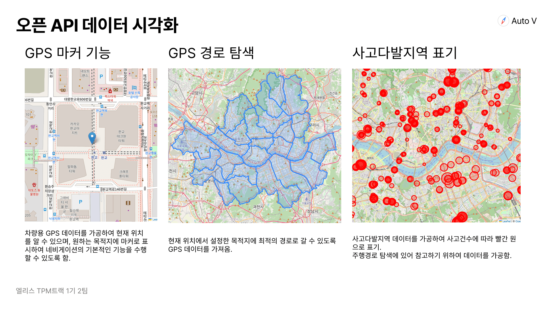 이 팀은 파이썬을 활용해 타사의 오픈 API를 직접 사용해 보았는데 MVP 모델 기획 시 도로 교통 데이터, GPS 트래킹 정보 등의 실제 데이터를 기반으로 기획한 내용이 눈에 띕니다.